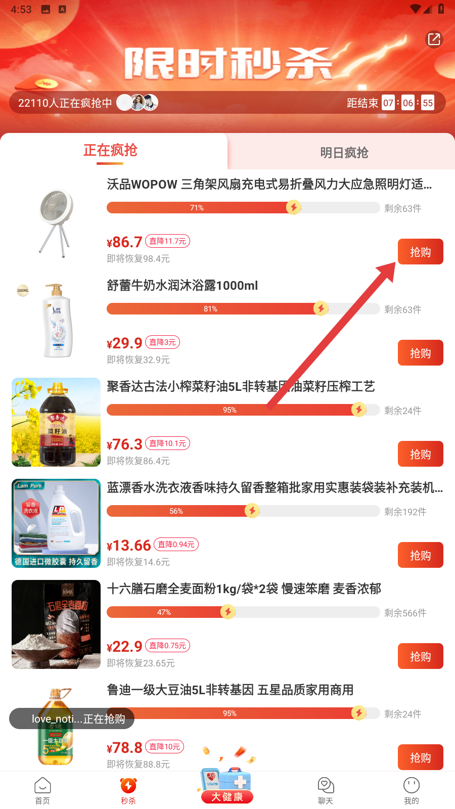 2、在秒杀页选商品,如磨砂膏,点【抢购】进入详情。