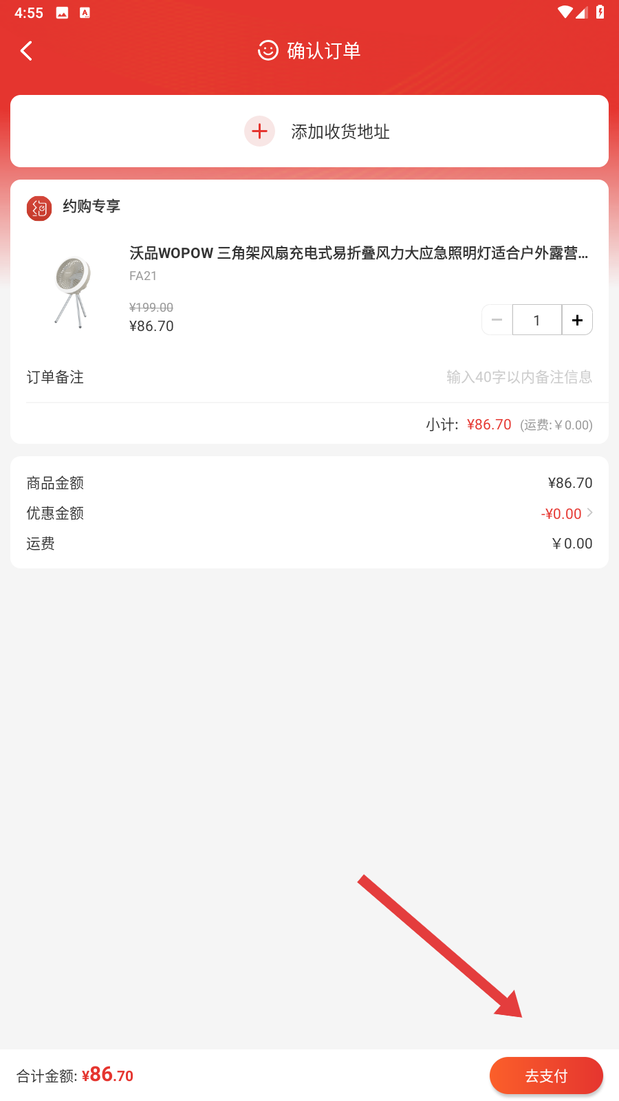 4、在确认订单页面,添加收货地址后点击【去支付】,完成付款就可以买到喜爱商品啦。
