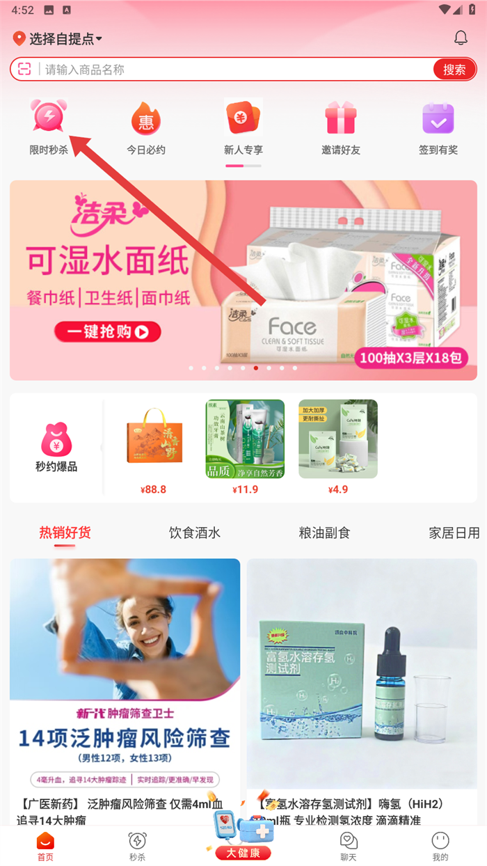 1、进入首页,点【限时秒杀】,进入秒杀活动页。