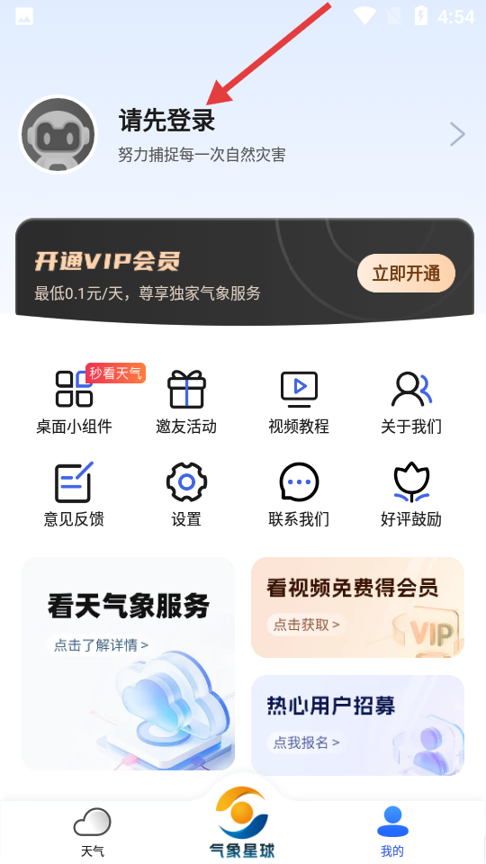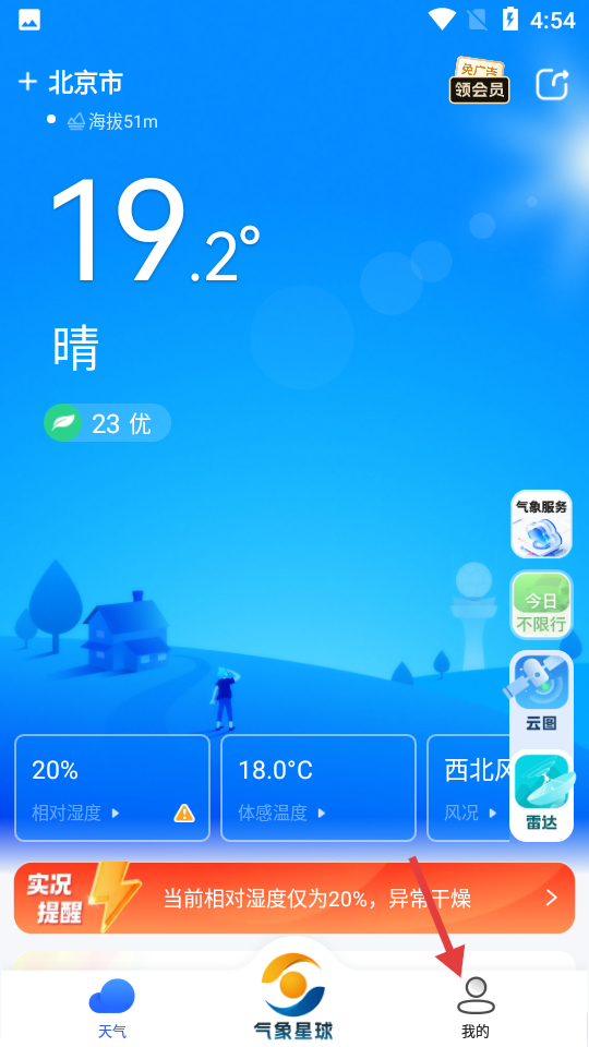 1、打开软件,进入【天气】界面,点击切换到【我的】页面。