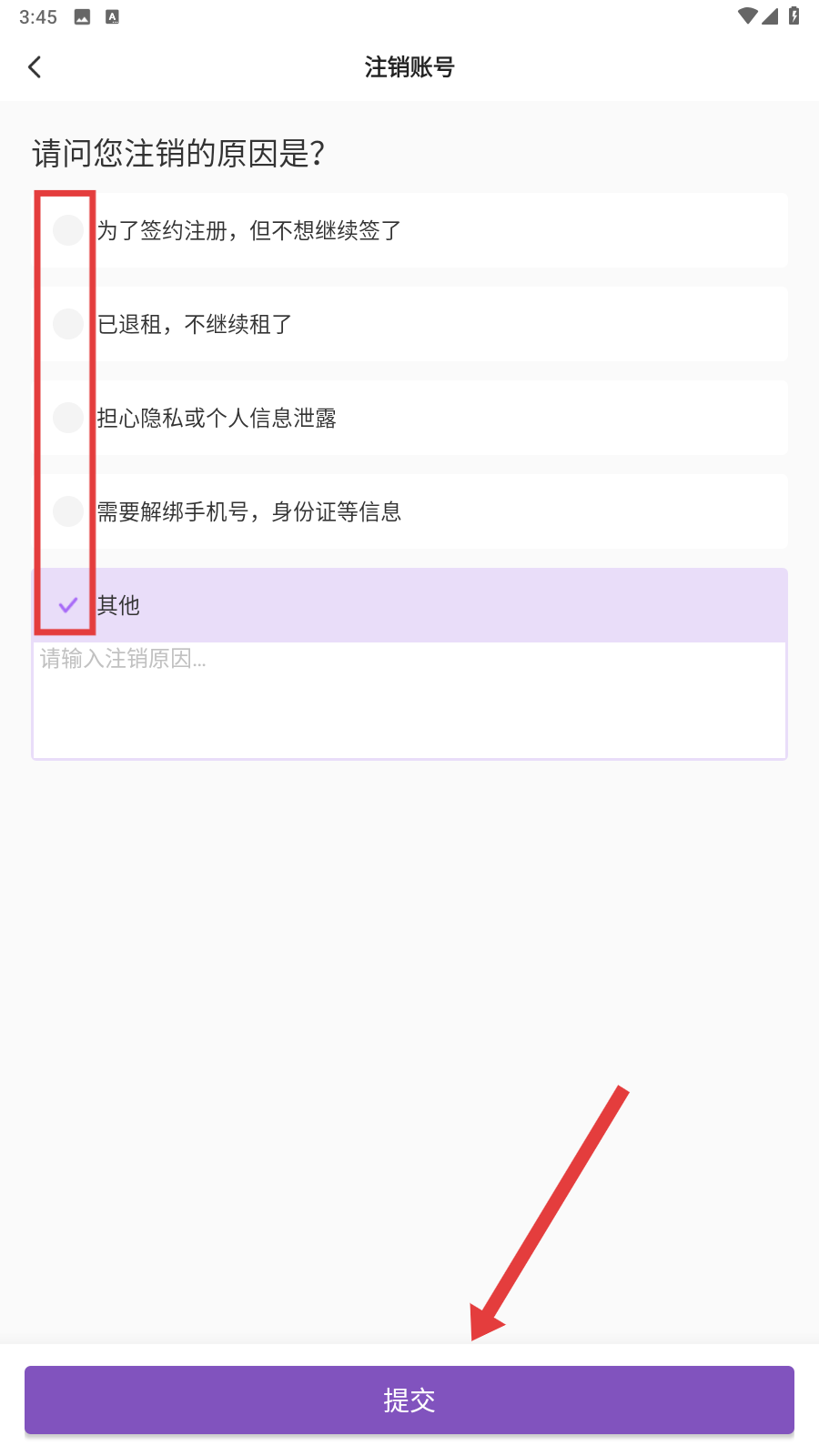 4、在注销账号页面,选择注销原因,比如【其他】,再点击【提交】,就能完成账号注销啦。