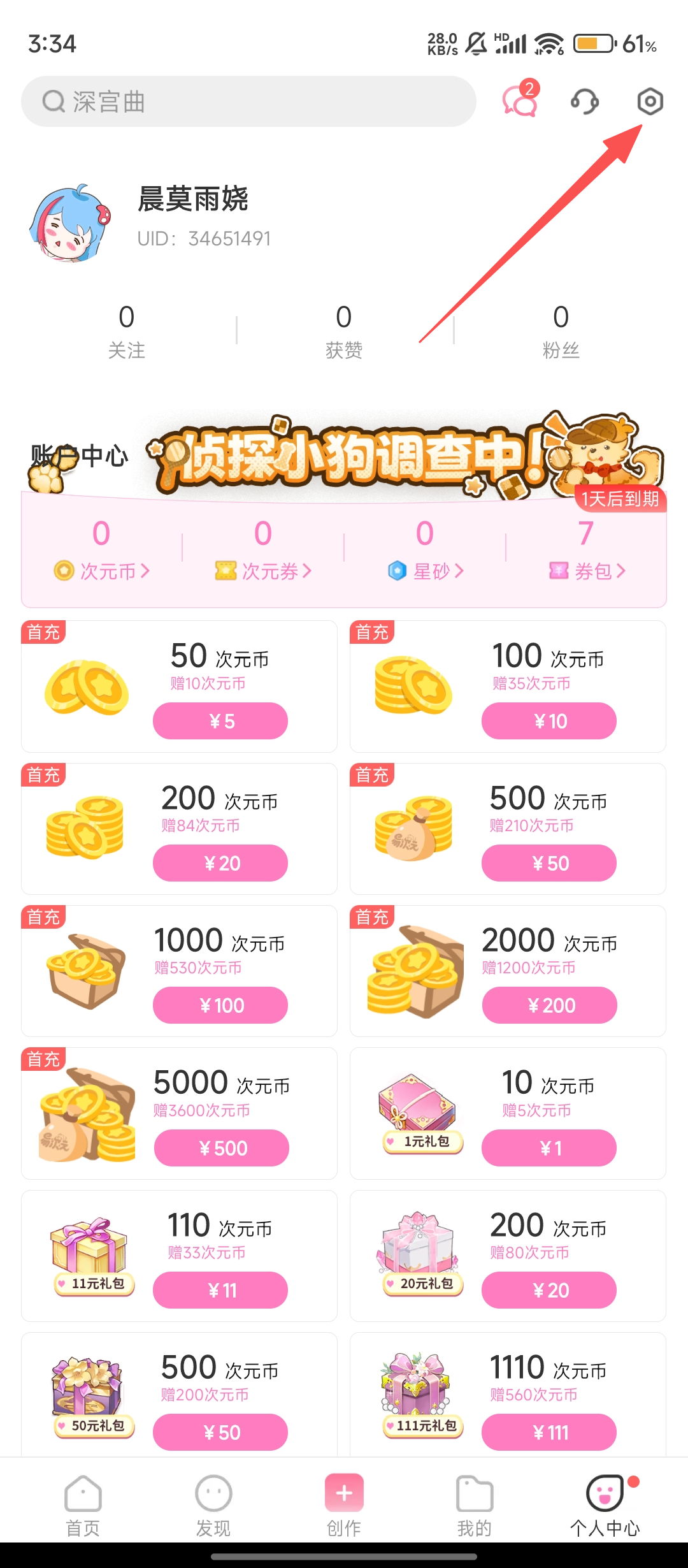 1、进入易次元个人中心,我们可以点击右上角【设置】图标,进入设置页面哦。