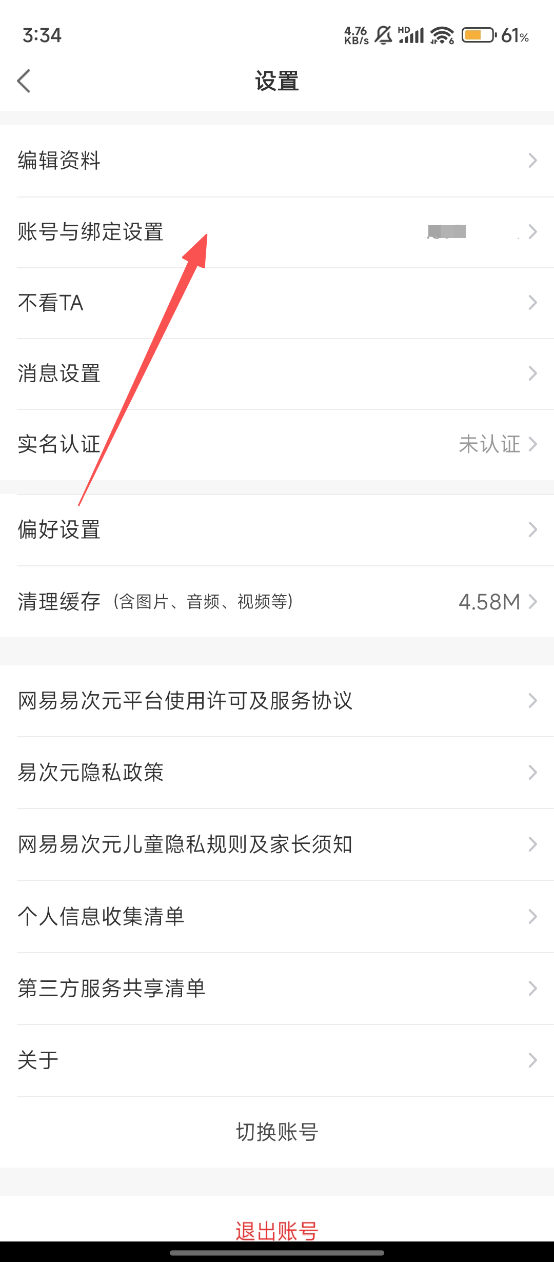 2、在设置页找到【账号与绑定设置】选项,点击进入账号管理板块呢。