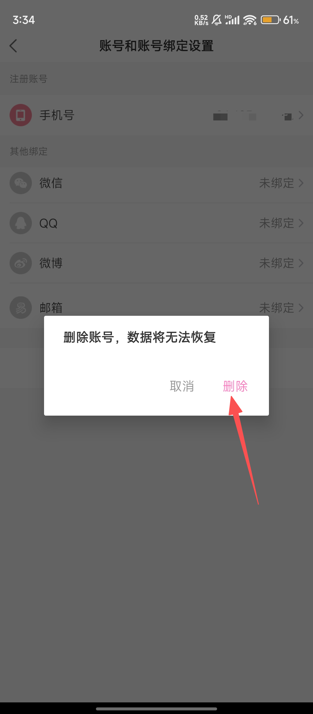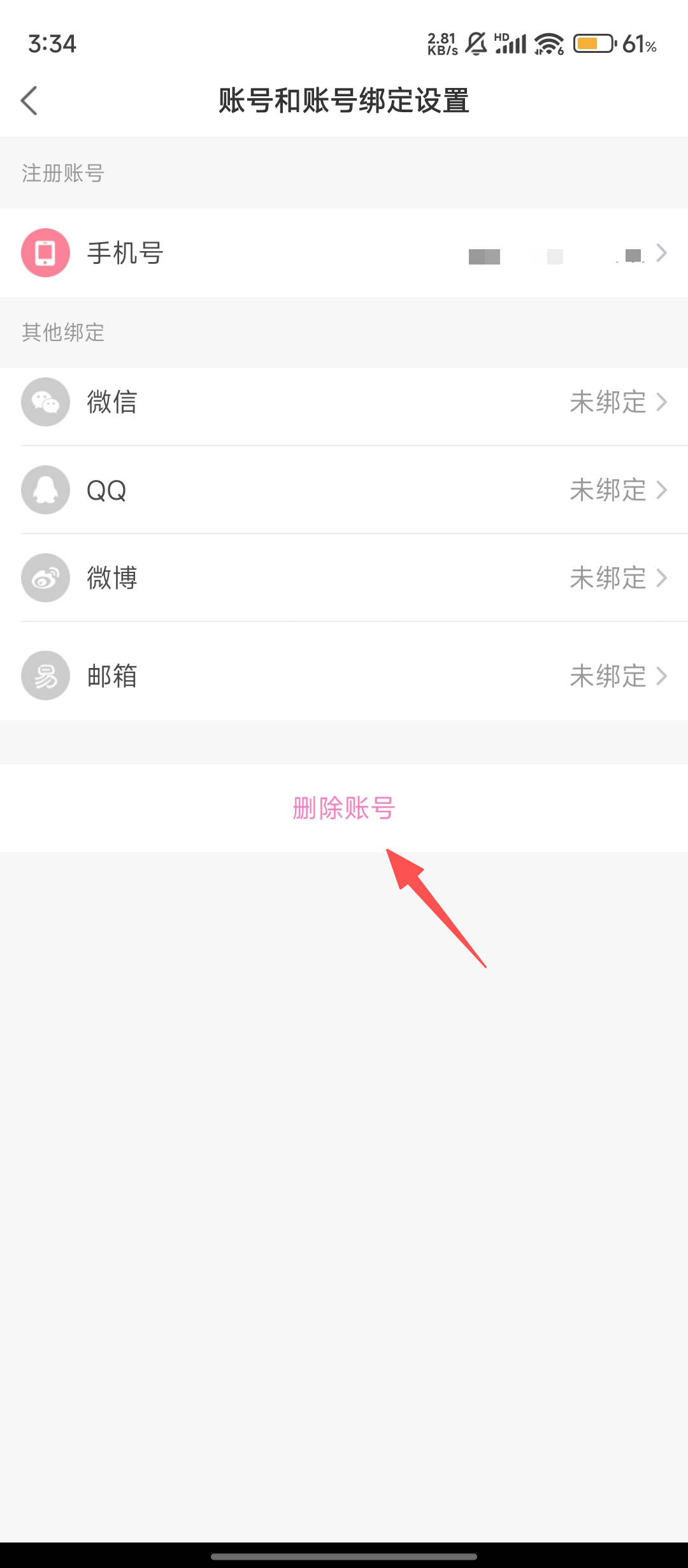 3、进入账号与绑定设置后,找到【删除账号】按钮并点击,准备进行账号注销操作呀。