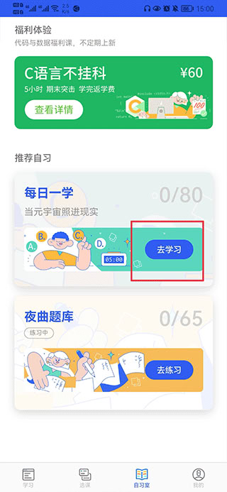 4、每日练习:完成“每日一学”后,点击“夜曲题库”进行巩固。