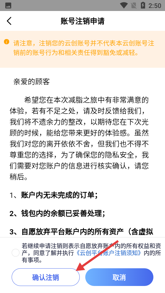 4、确认账户内无未完成订单、钱包余额已妥善处理等条件后,点击【确认注销】,完成账号注销。