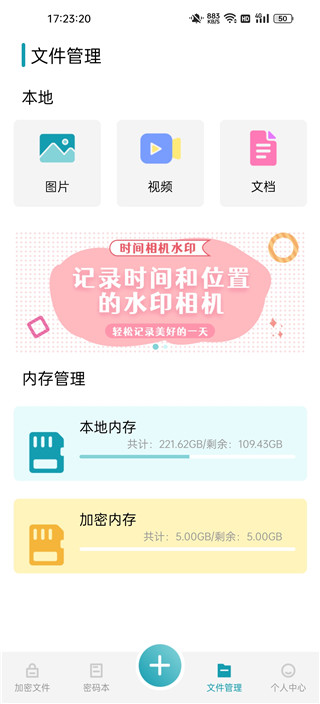 4、文件管理 - 呈现清晰分类布局,单次操作即可调取手机相册资源,极大简化图片、视频、文档的上传流程,同时实时展示本地与加密存储空间的内存状态,方便您随时掌握剩余容量。