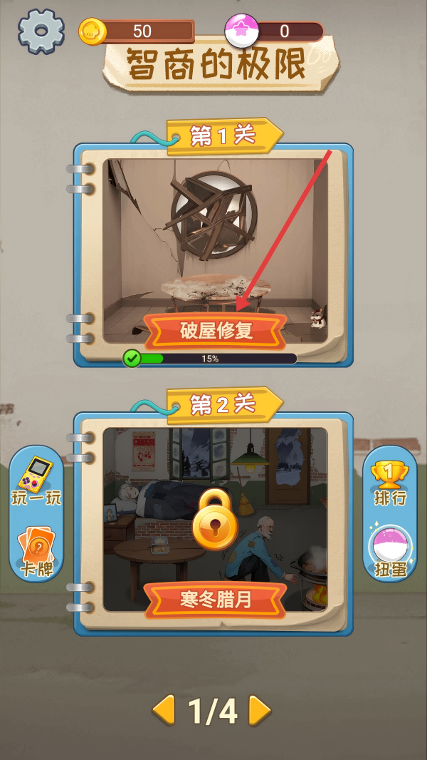 1、在游戏关卡选择界面,选择第1关【破屋修复】。