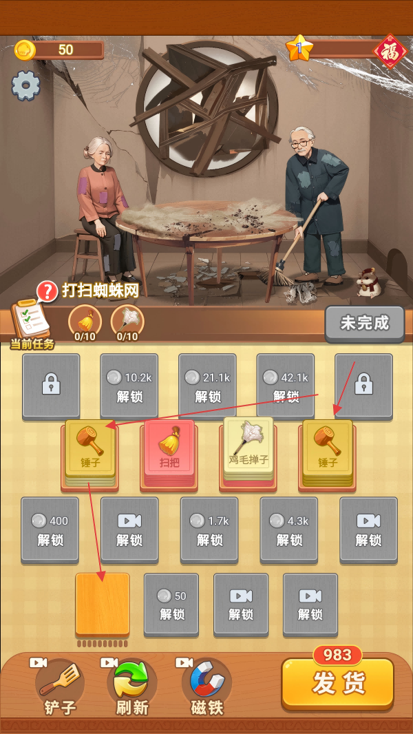 3、根据【打扫蜘蛛网】当前任务,将相同的工具合并在一起,放置橙色空白处升级道具。