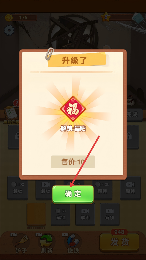 4、升级后就会获取新的道具,点击【确定】按钮,确认解锁,继续推进房屋修复与经营。