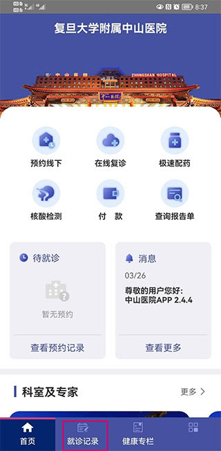 1、打开上海中山医院 APP,点击【预约就诊】。