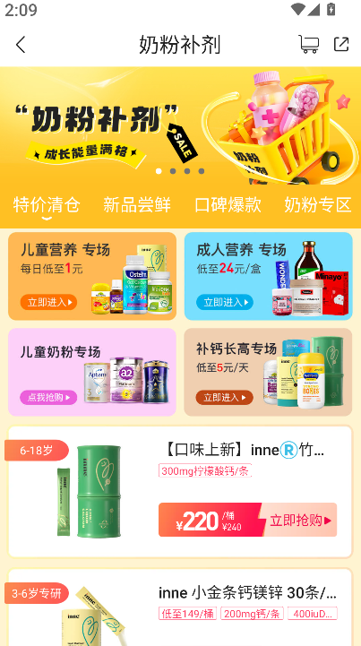 2、在商城中选择“奶粉补剂”板块,可进入儿童专场区域,了解不同品牌与配方的奶粉及营养补充品信息。