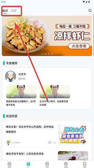 4、点击【知识】,可以看到左上角有【知识】【视频】两个选择,会提供丰富的健康科普知识