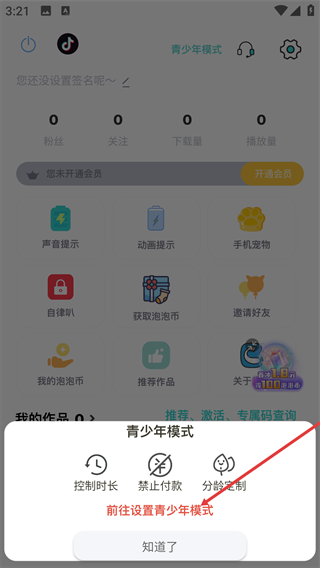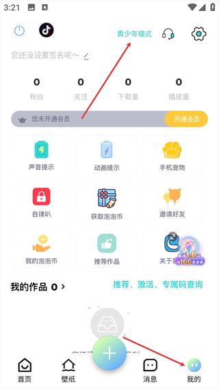 1、进入【我的】页面,可看到顶部的【青少年模式】按钮。