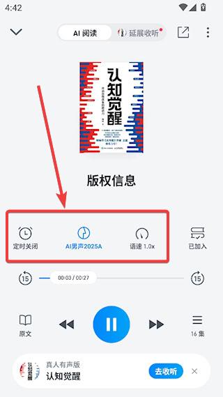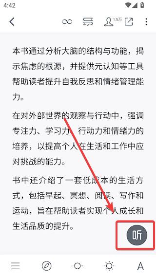 6、点击【听】可以开启听书模式,支持设置听书时间、声音设置、语速调整、章节选取等