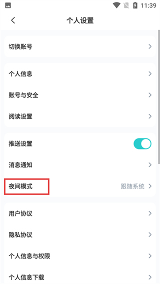 3、进入【个人设置】页面,点击【夜间模式】选项,可进入夜间模式的设置界面。