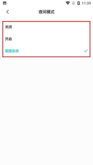 4、进入【夜间模式】页面,可选择【关闭】【开启】【跟随系统】三种状态,按需切换以调整阅读时的界面显示模式。