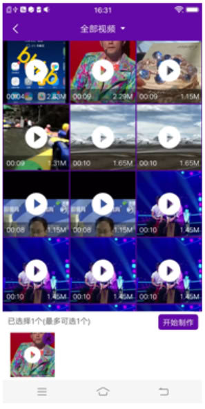 1、首页点击视频剪辑按钮,即可进入视频选择页面,选择视频即可制作。