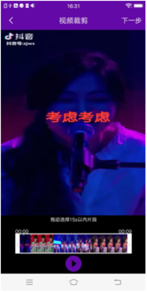 2、视频剪裁:可以拖动下方白块选择想要编辑的15s内视频。