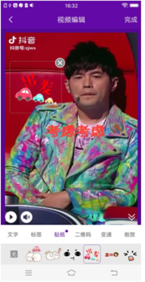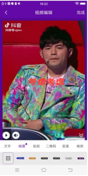 3、视频编辑:点击下方功能按钮项,可以进行相应操作,比如选择边框、选择音乐、添加文字、标签、贴纸、二维码等等,还可以进行变速处理、视频倒放、视频镜像等功能。