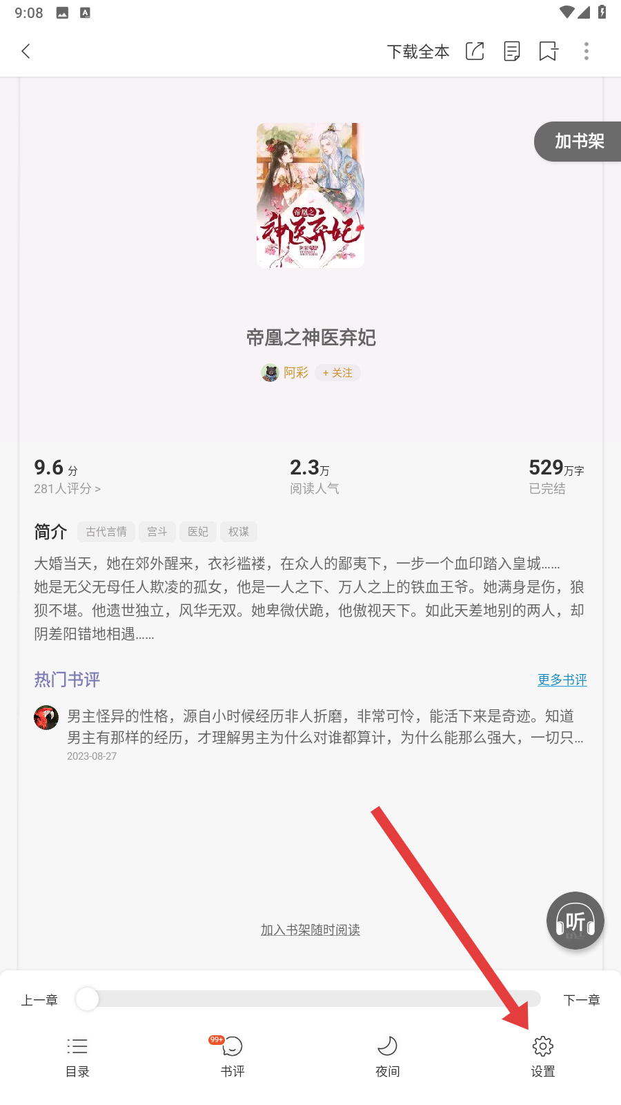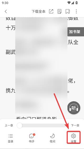 3、进入阅读页面后,点击底部的【设置】按钮,就能找到调节亮度的入口哟。