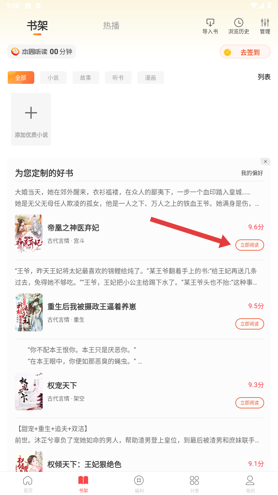 2、在书架的【为您定制的好书】里,选择一本喜欢的书,点击【立即阅读】,就能进入阅读页面啦。