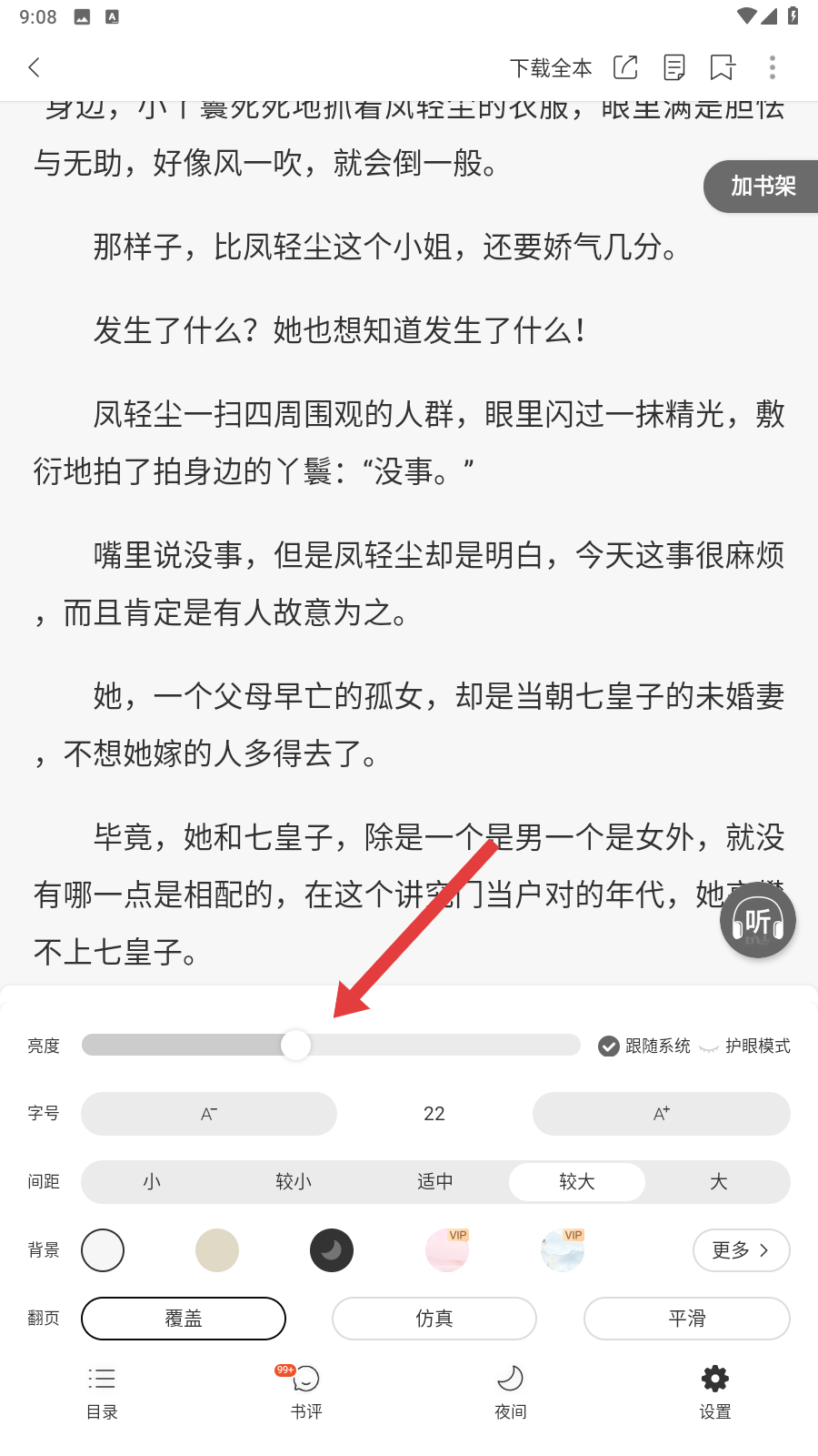 4、在设置界面,找到【亮度】滑块,左右拖动它,就能调整到适合自己的亮度,让阅读更舒适呢。
