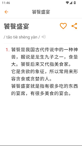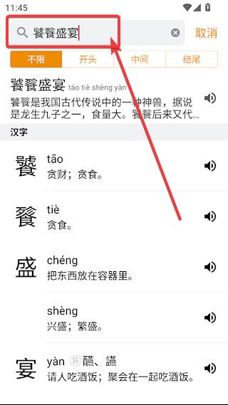 2、点击搜索栏,输入想要查询的成语,就能获得这个成语的相关典故、基本词义,每一个字的读音