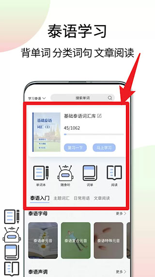 2、选择“学习泰语”模块,进入基础词汇库,依进度学词汇、复习单词或开启阅读练习。