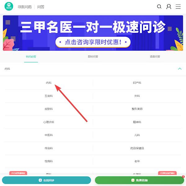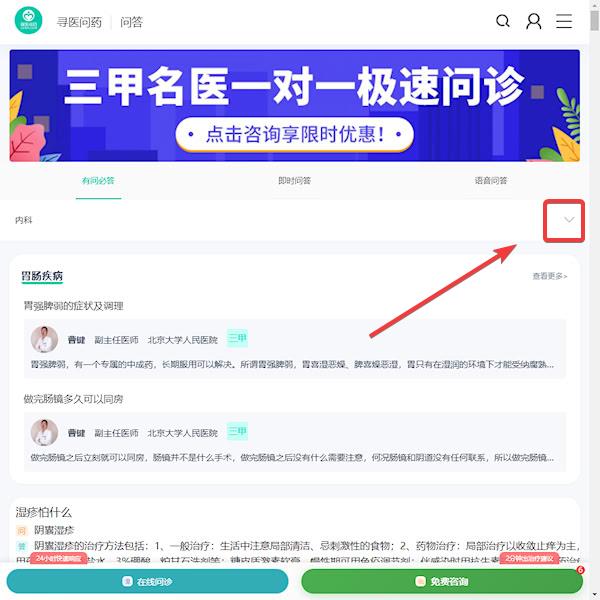 3、找到需要咨询的科室,以‘内科’为例