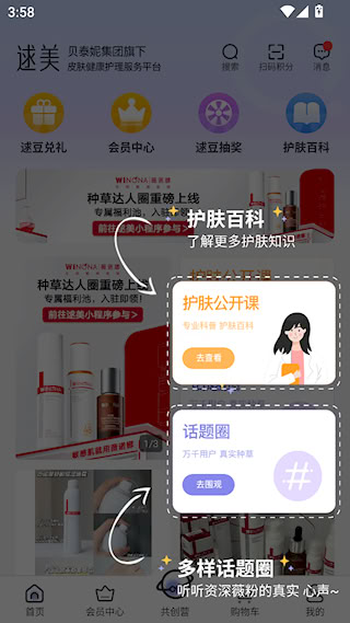 1、注册后登陆,在首页点击护肤公开课、话题圈可以了解更多护肤知识