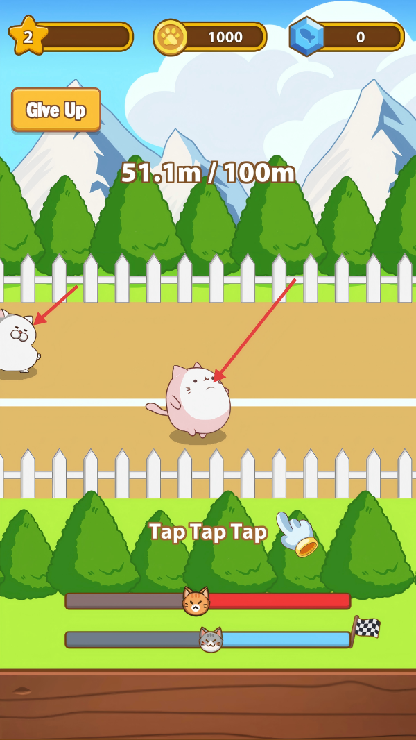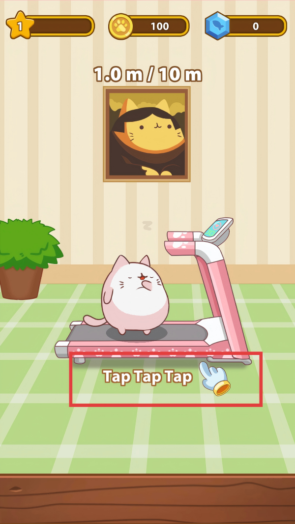 1、根据提示【TapTapTap】,点击屏幕让猫咪在跑步机上运动,积累距离和金币。