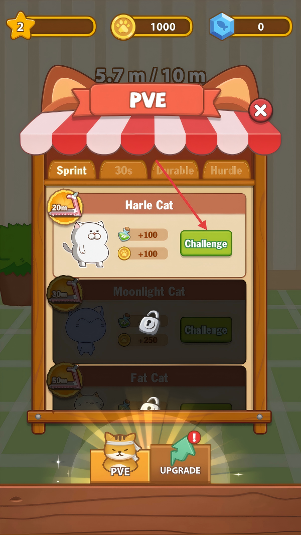 2、进入PVE模式界面,选择可挑战的猫咪,点击【Challenge】按钮,发起挑战。