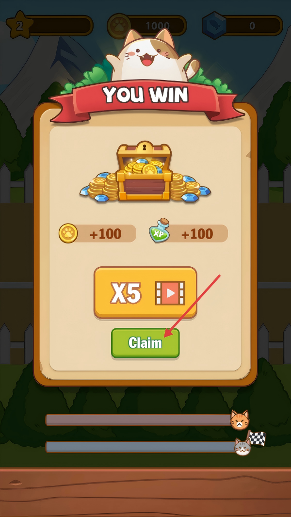 4、成功获胜后,界面显示【YOUWIN】,点击【Claim】按钮,领取金币和经验等奖励。