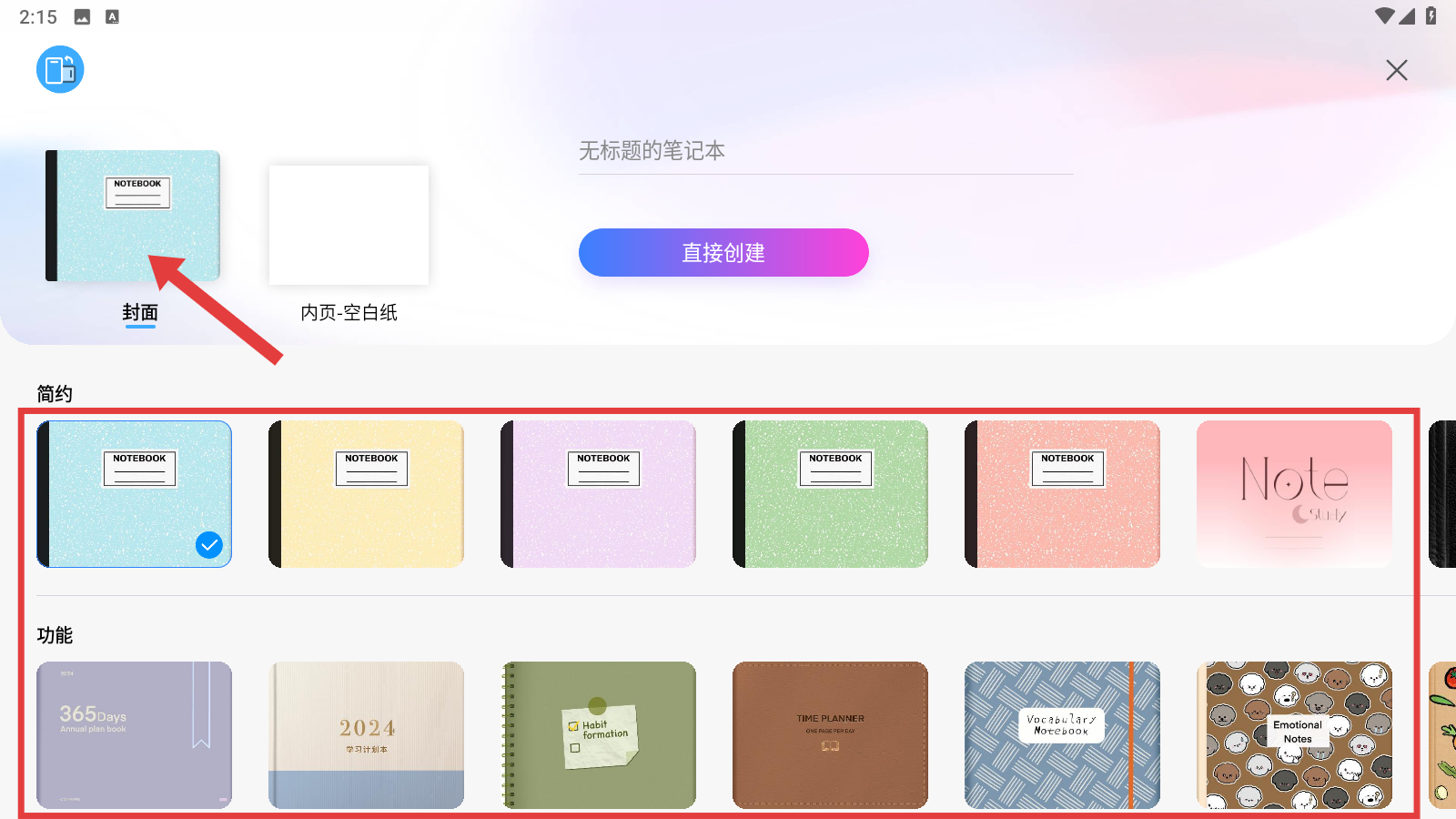 2、在封面选择界面,挑选喜欢的封面样式,比如简约风或功能风的笔记本封面,让笔记更具个性哦。