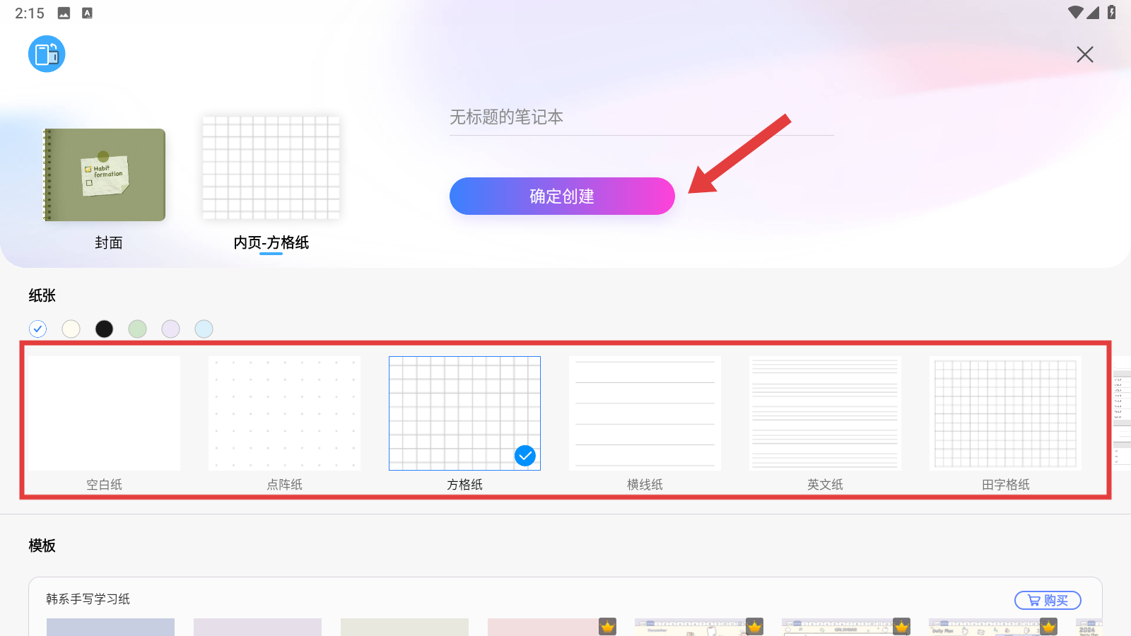 3、接着选择内页纸张,像方格纸、横线纸等都可选择,选好后点击【确定创建】,就能生成新笔记啦。