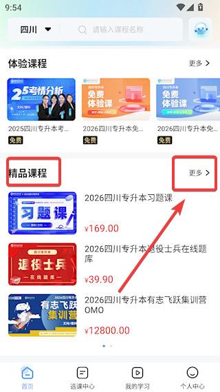 3、首页下拉可以看到精品课程,点击更多