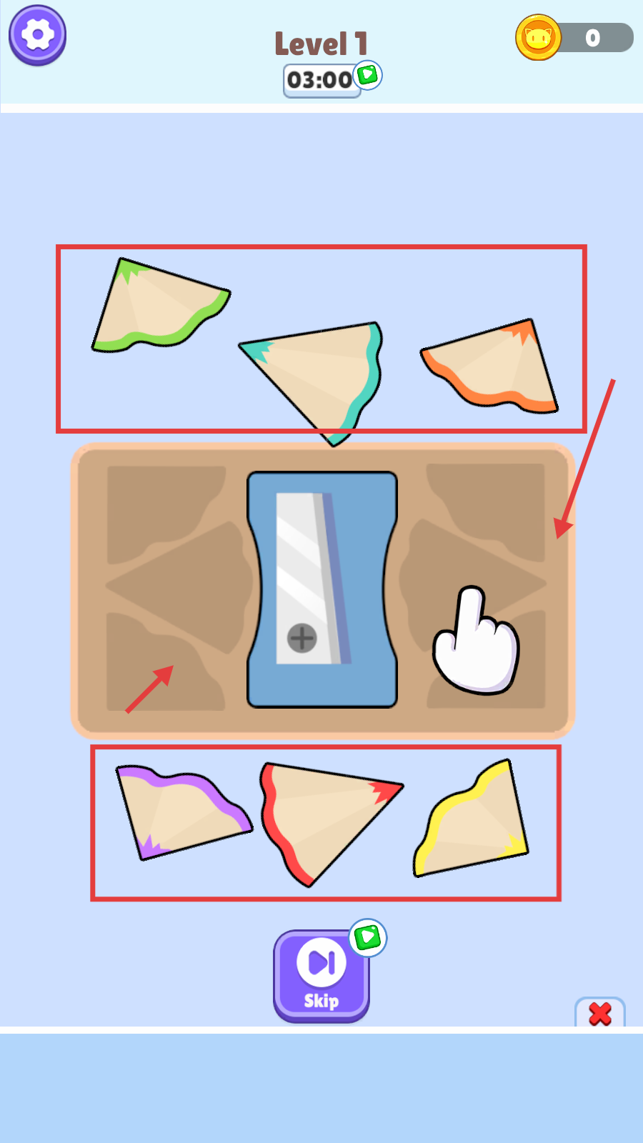 1、在【关卡1】里,把彩色碎片拖进对应形状的凹槽,拼好物品完成挑战。