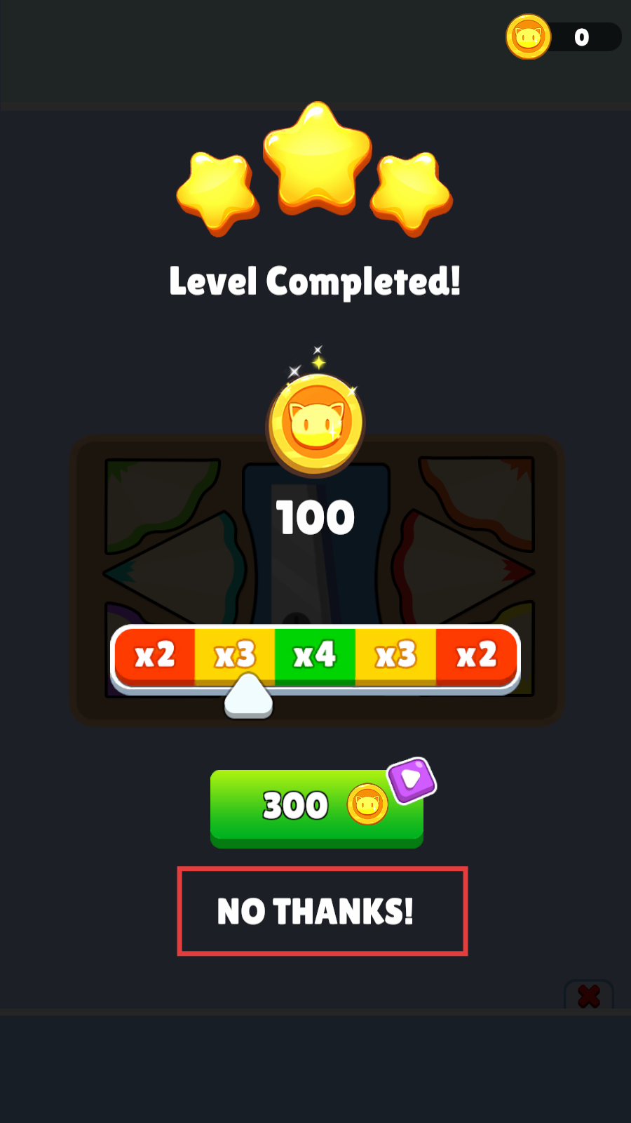 4、关卡完成后,若不想看视频领奖励,点击【NOTHANKS】,再选择新关卡继续挑战吧。