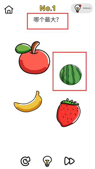 1、面对【哪个最大?】的问题,选择体积明显更大的西瓜即可推进关卡。