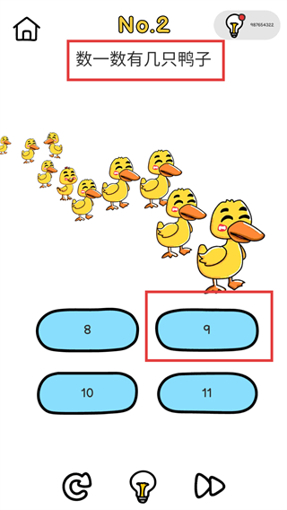 3、遇到【数一数有几只鸭子】的问题时,仔细数清画面里的小鸭总数,选择数字【9】的按钮来完成关卡。