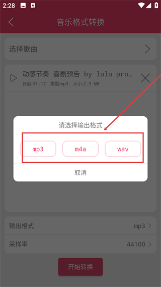 4、选择所需的格式(如mp3、m4a、wav),进行格式转换。