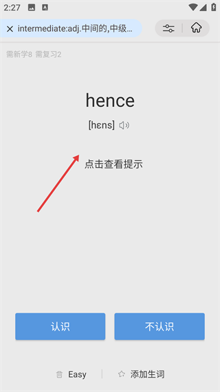 2、进入单词学习界面,根据熟悉度选【认识】或【不认识】记录掌握情况。