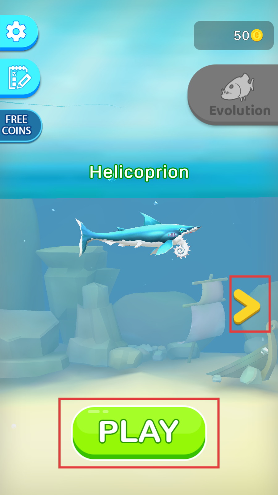 1、点击右侧按键切换鲨鱼种类,再点击主界面绿色【PLAY】按钮,操控鲨鱼进入吞噬冒险。