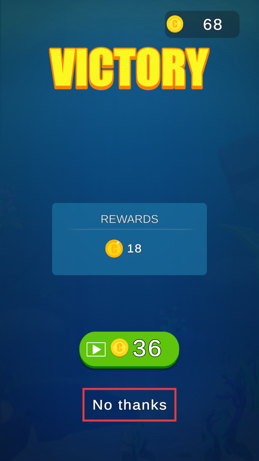 4、游戏胜利后,点击【Nothanks】直接领取基础金币,用于强化鲨鱼实力,争取成为这片海域的霸主。