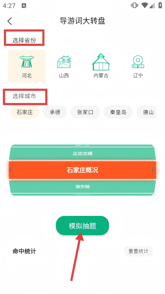 3、在【导游词大转盘】页,先选择省份和城市,再点击【模拟抽题】按钮。