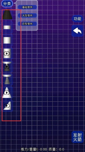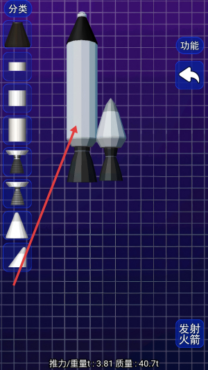 3、组合不同零件,调整火箭形态,查看推力重量比等参数优化。