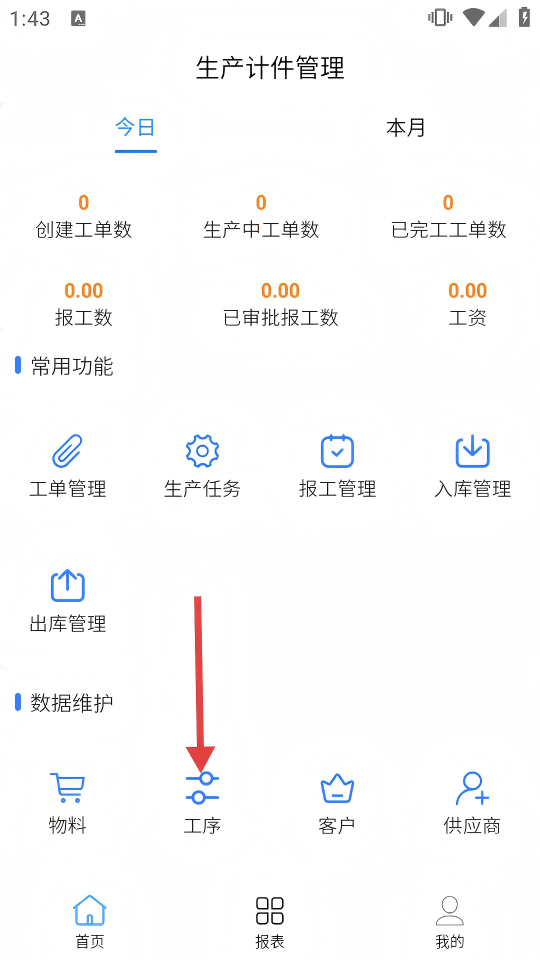 1、在服务协议和隐私政策弹窗中,点击【同意并接受】按钮,进入生产计件管理主界面。