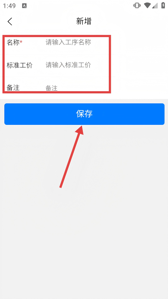 4、在新增工序页面,填写【名称】【标准工价】【备注】信息后,点击【保存】按钮完成工序新增操作。