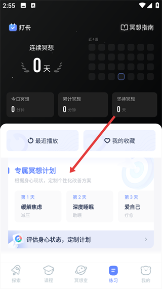 2、在练习界面中,定位到“专属冥想计划”板块,进入计划定制流程。